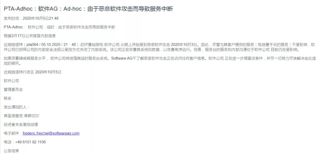 Software AG公开披露了该事件,当时该事件表明该公司“由于恶意软件攻击”而面临内部网络中断。