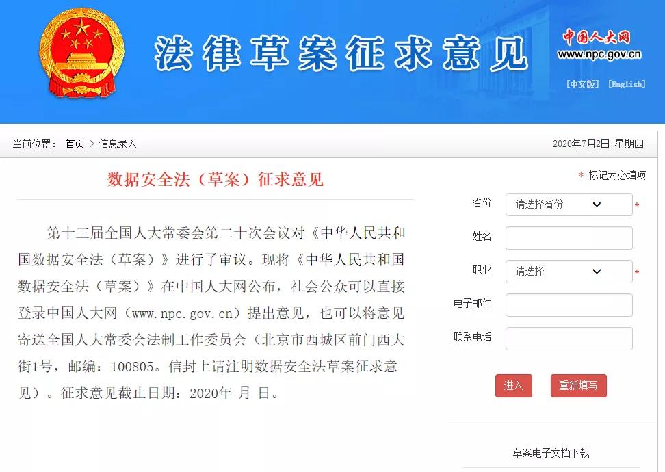 第十三届全国人大常委会第二十次会议对《中华人民共和国数据安全法(草案)》(以下简称《数据安全法(草案)》)进行了审议。《数据安全法(草案)》现已公布在中国人大网,面向社会公众征求意见。